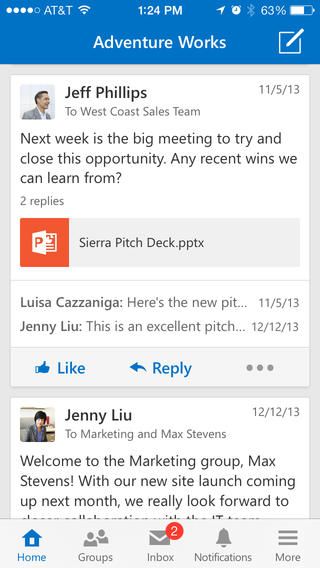 В двух словах, что такое Yammer – это facebook компании. Здесь сотрудники компании вместе работают в тематических группах над какими-то проектами, документами; обсуждают новости, проводят конкурсы и мозговые штурмы. Тут можно «лайкать» сообщения других пользователей или предложить новую идею, обсудить фото или поздравить с днем рождения.