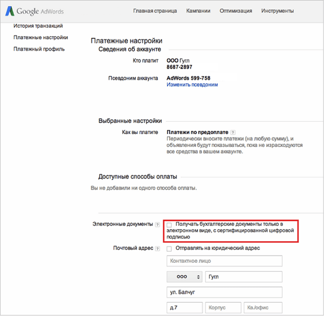 Новые документы по аккаунту будут предоставляться в электронном виде. Если у вашей организации несколько аккаунтов в Google AdWords, то подключать эту возможность нужно отдельно для каждого аккаунта.