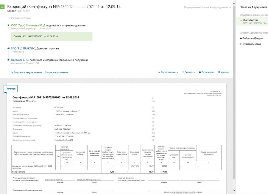 При переходе на ЭДО рекламодателям больше не придётся скачивать электронные копии документов из аккаунта AdWords и ждать доставку оригиналов по почте. Документы всегда будут доступны в аккаунте Диадок. Со всеми документами можно работать онлайн: согласовывать, печатать, сверять, отклонять, и так далее. Они полностью юридически значимы и не требуют дублирования на бумаге.